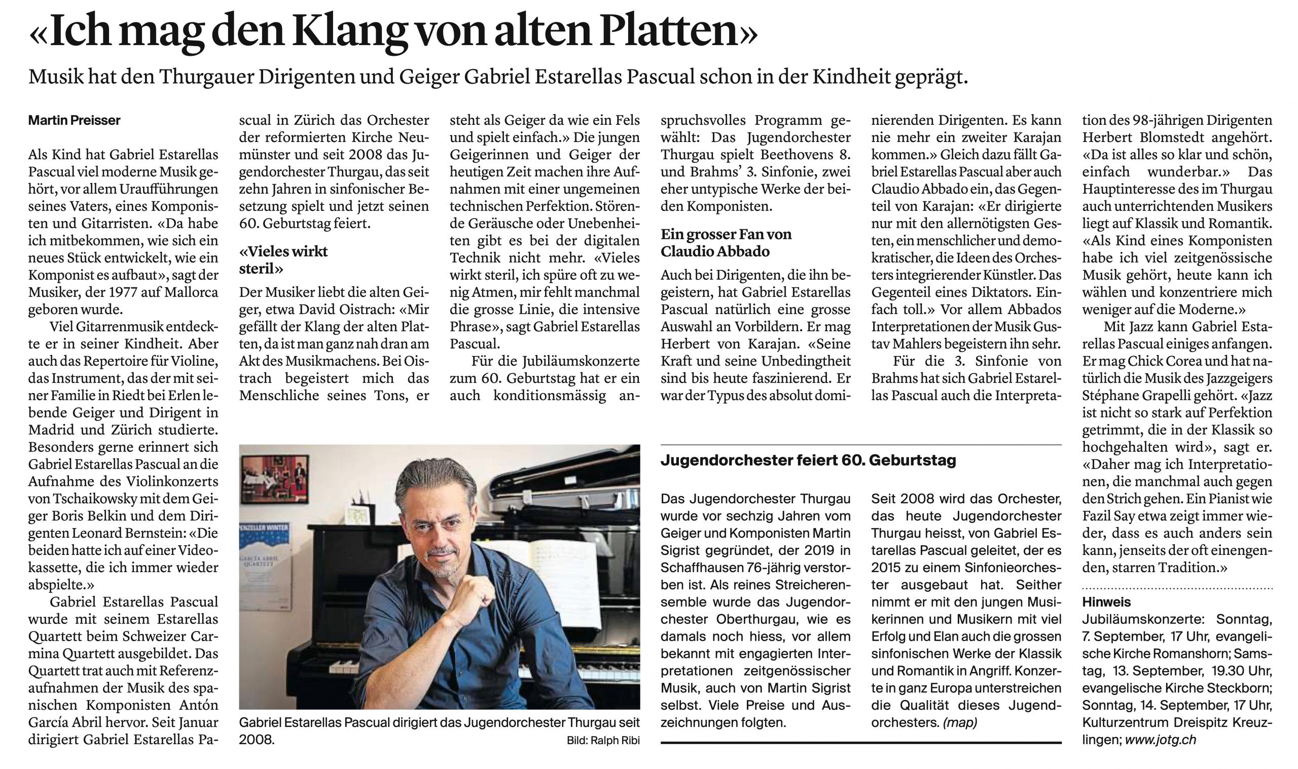 Musik hat den Thurgauer Dirigenten und Geiger Gabriel Estarellas Pascual schon in der Kindheit geprägt. Er liebt Interpretationen klassischer Musik aus der Zeit vor der digitalen Aufnahmetechnik, die er oft ein wenig steril und zu durchgestylt empfindet. Nächste Woche feiert er den 60. Geburtstag des Jugendorchesters Thurgau. LINK TAGBLATT.CH